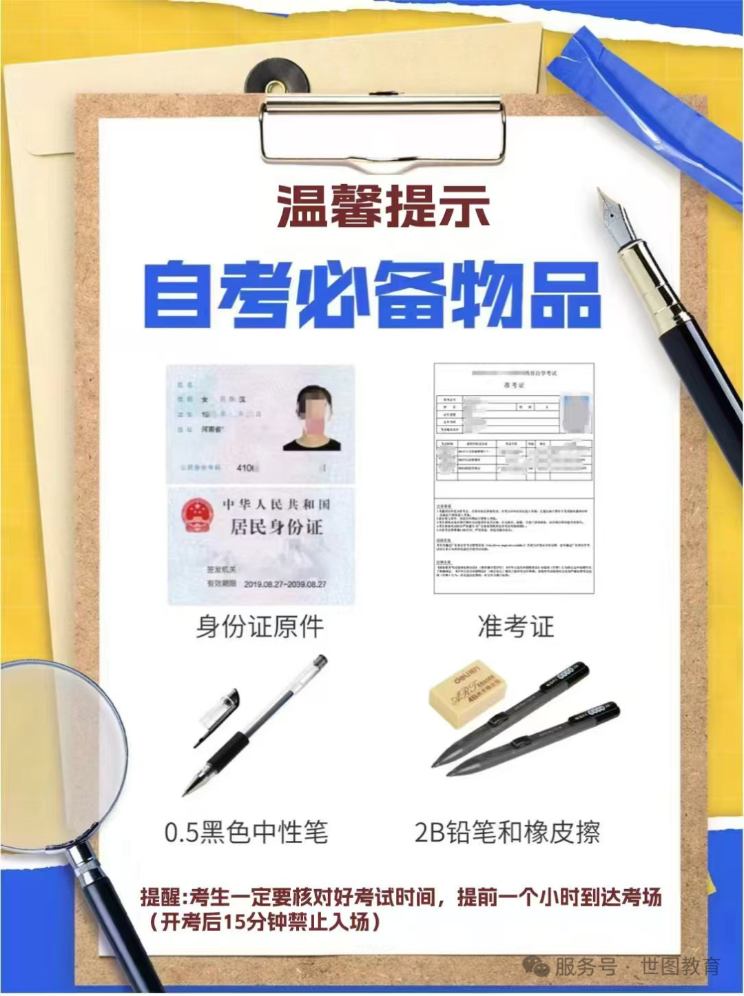温馨提示:请考生们提前规划好出行路线、备好考试物品(身份证原件+打印准考证、黑色签字笔、2B铅笔、橡皮擦等,参考如下图:)